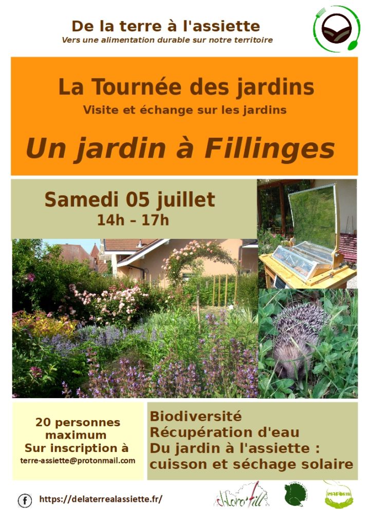 La tournée des jardins : un jardin à Fillinges • 5/7/2025 Publié par delaterrealassiette | Juin 21, 2025 | Les événements, Tournée des jardins | 0 La tournée des jardins continue avec un jardin à Fillinges Le Samedi 5 Juillet 2025, de 14h00 à 17h00 biodiversité récupération d’eau cuisson et séchage solaires Sur inscription à terre-assiette@protonmail.com, nombre de places limité